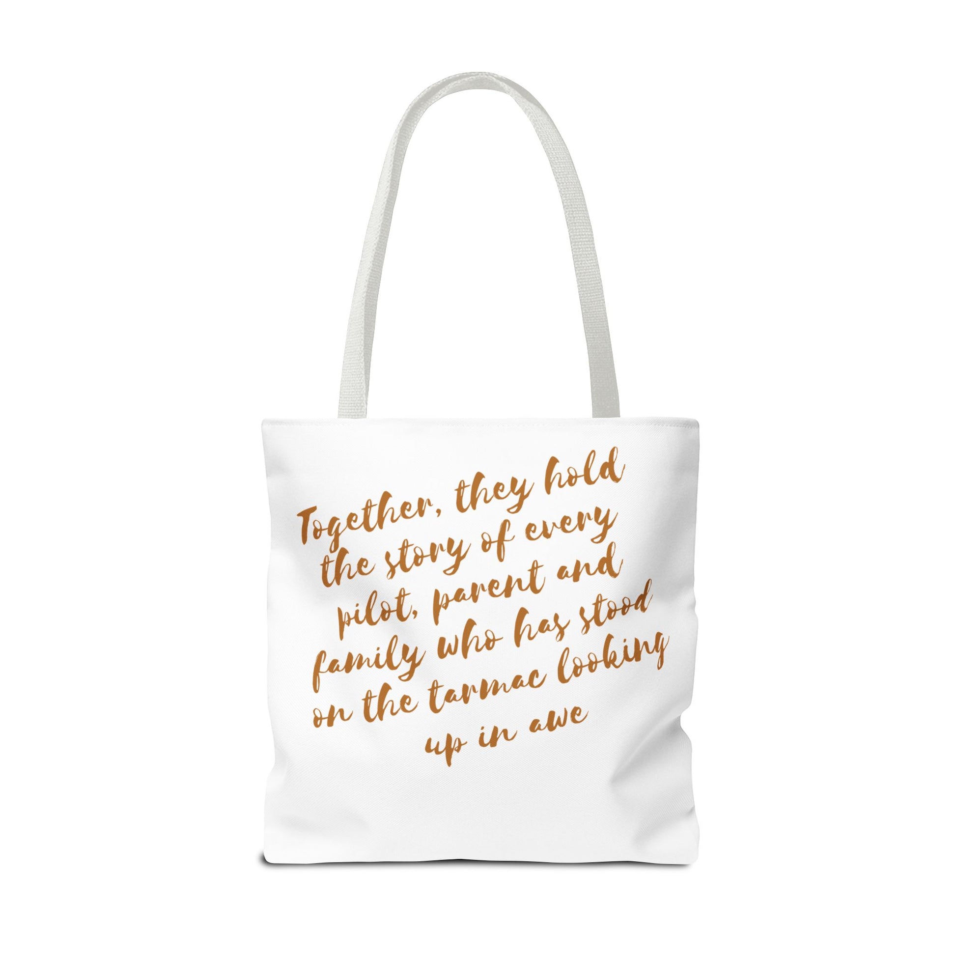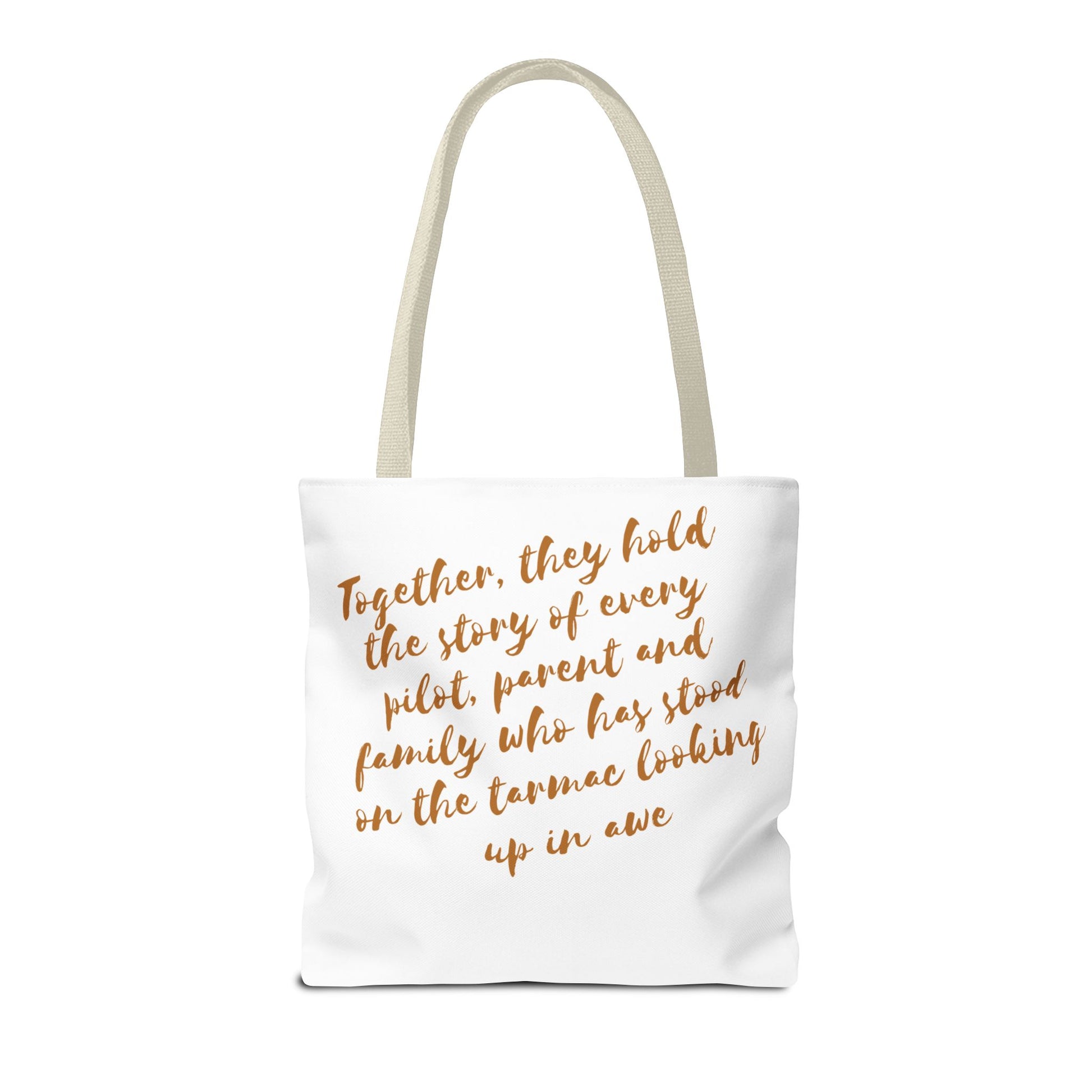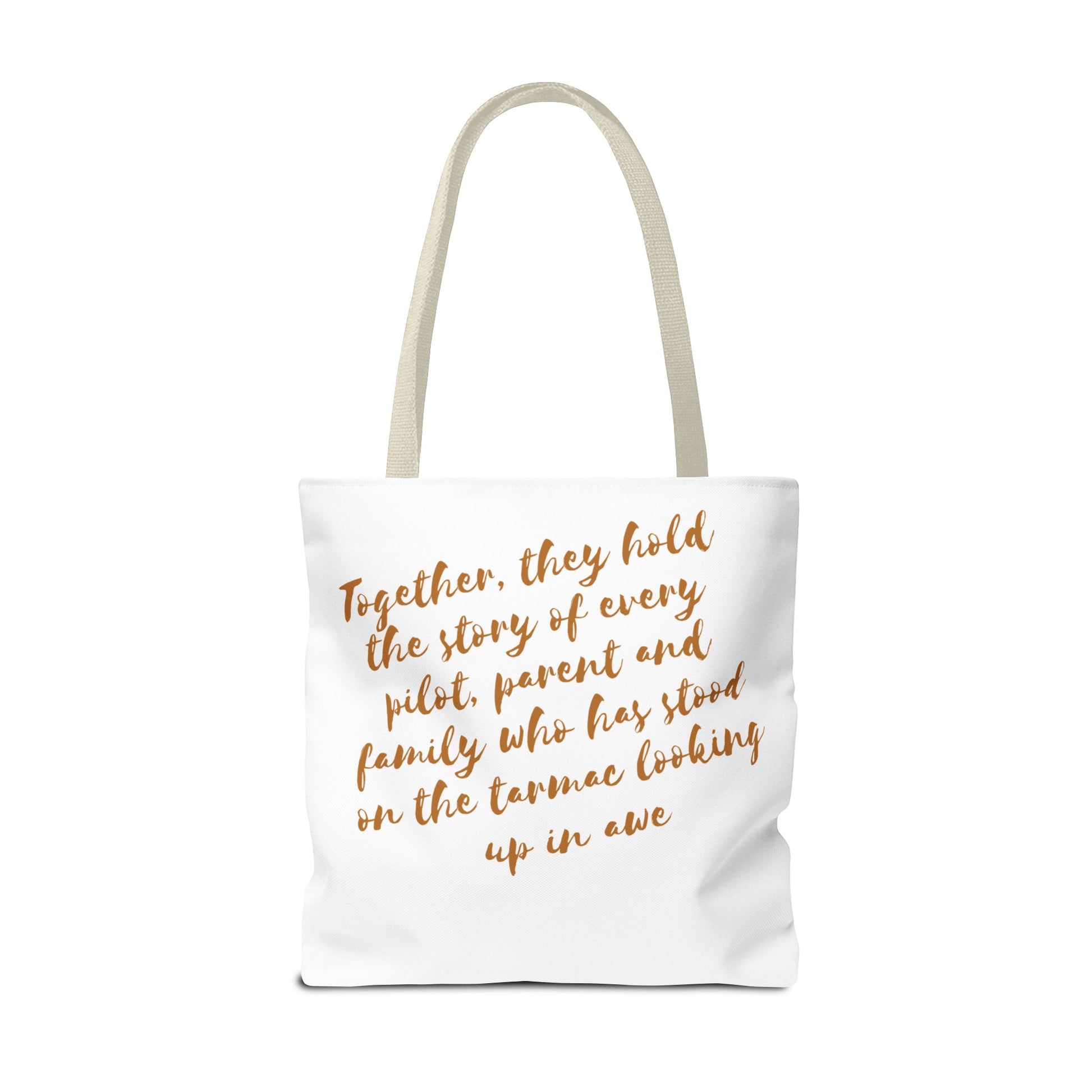 Light, roomy, and built to carry the things that keep your life moving. This polyester tote brings a clean, travel-inspired design to everyday errands: a small airplane icon and a warm, handwritten line of text trace the bag’s face, while a heartfelt message sits across the back in soft, coppery script. Boxed corners give the bag structure and extra capacity; reinforced handle stitching and a laminated interior add durability and spill resistance. Choose your handle color and size to match your routine — from market runs to gate-to-gate packing — and let this tote quietly tell the story of journeys, family, and the small rituals that connect them.