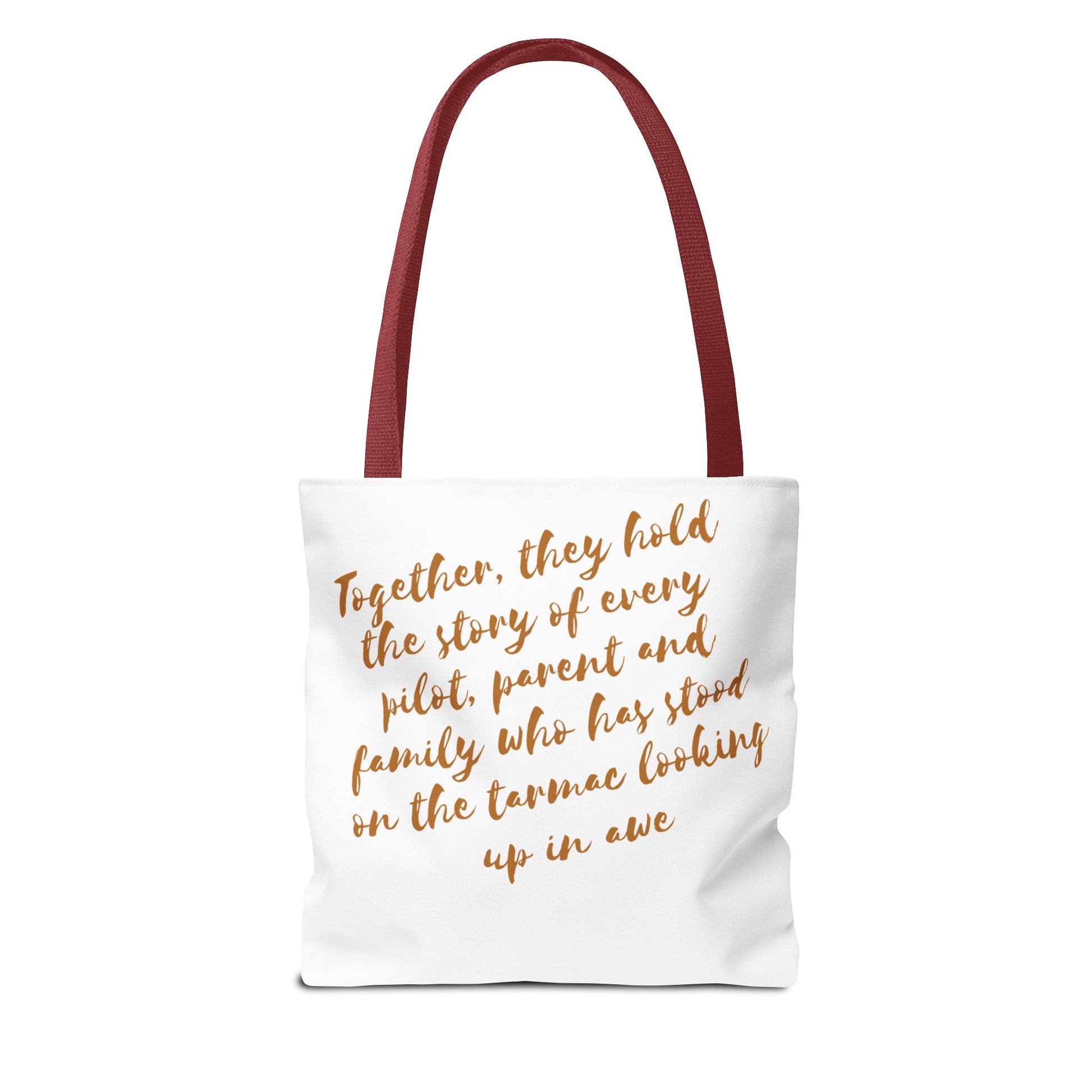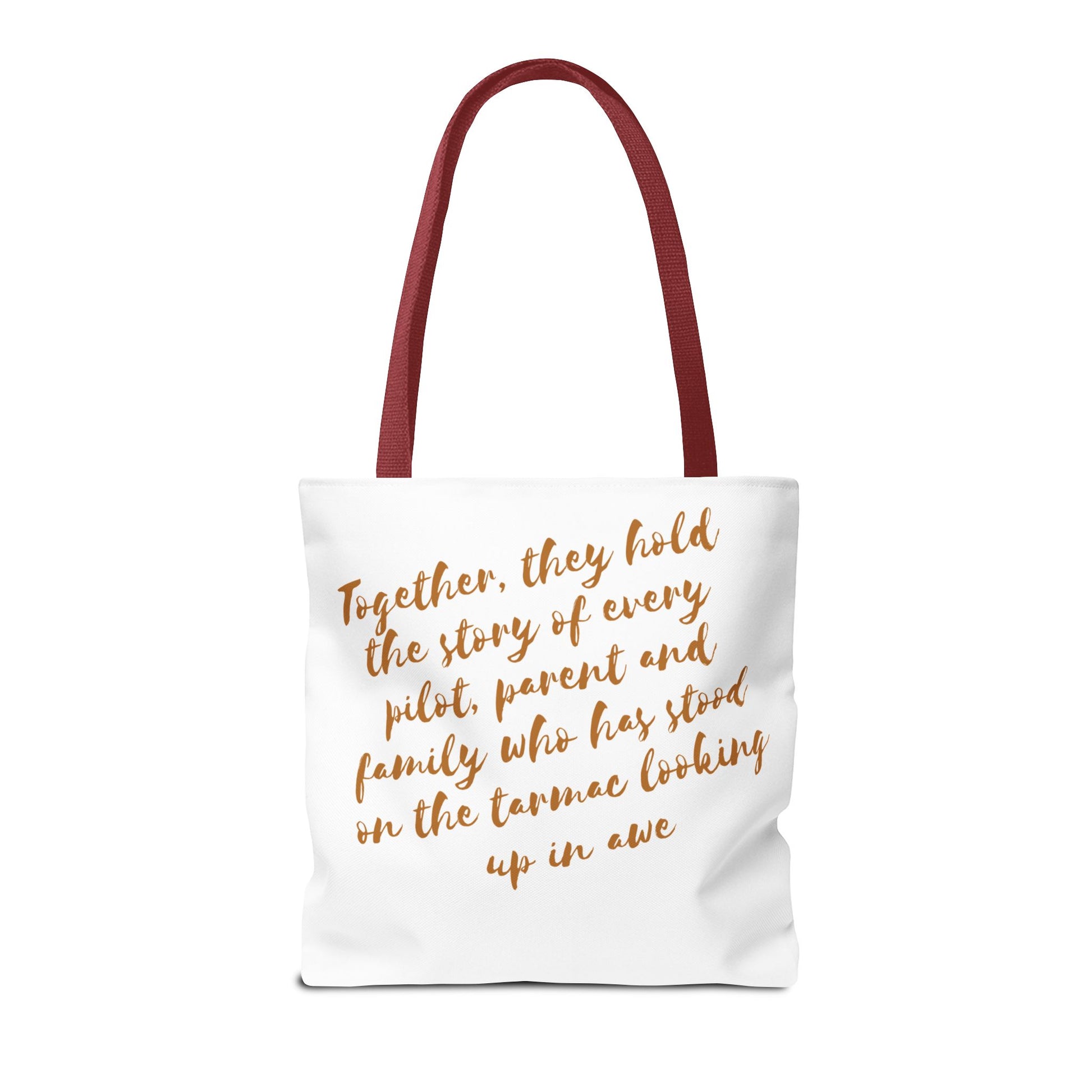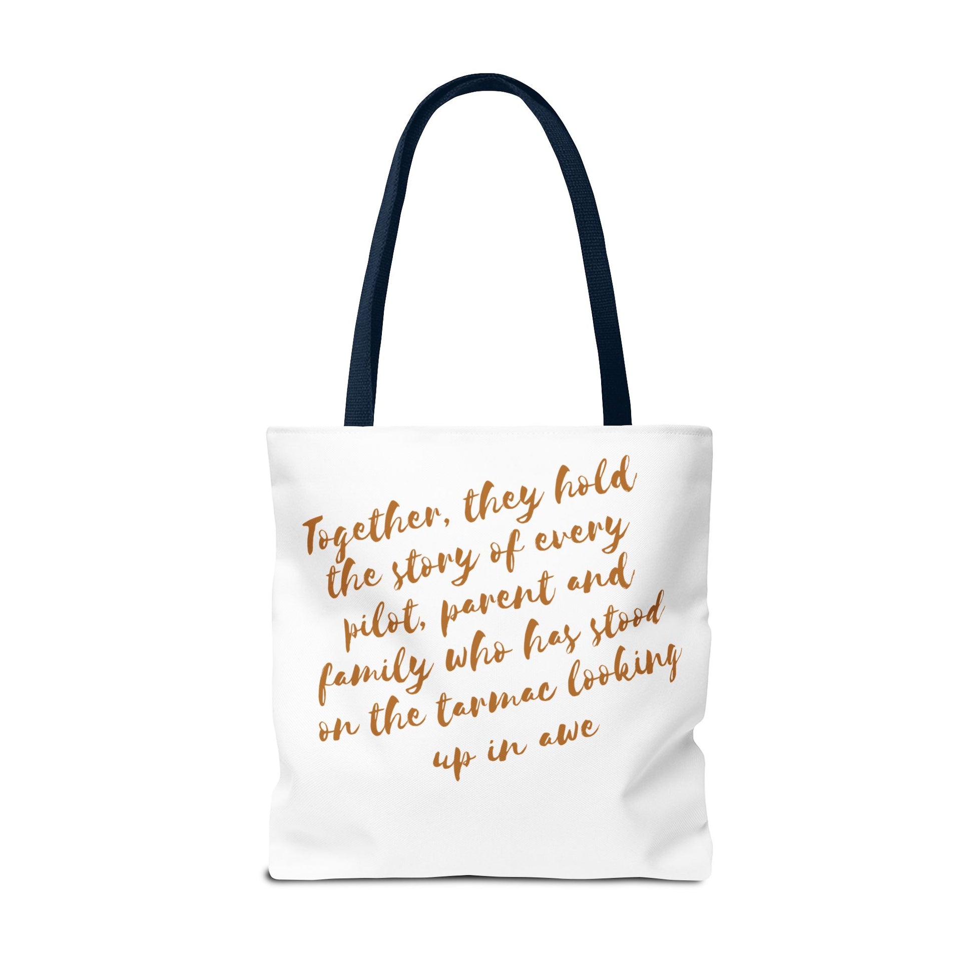 Light, roomy, and built to carry the things that keep your life moving. This polyester tote brings a clean, travel-inspired design to everyday errands: a small airplane icon and a warm, handwritten line of text trace the bag’s face, while a heartfelt message sits across the back in soft, coppery script. Boxed corners give the bag structure and extra capacity; reinforced handle stitching and a laminated interior add durability and spill resistance. Choose your handle color and size to match your routine — from market runs to gate-to-gate packing — and let this tote quietly tell the story of journeys, family, and the small rituals that connect them.